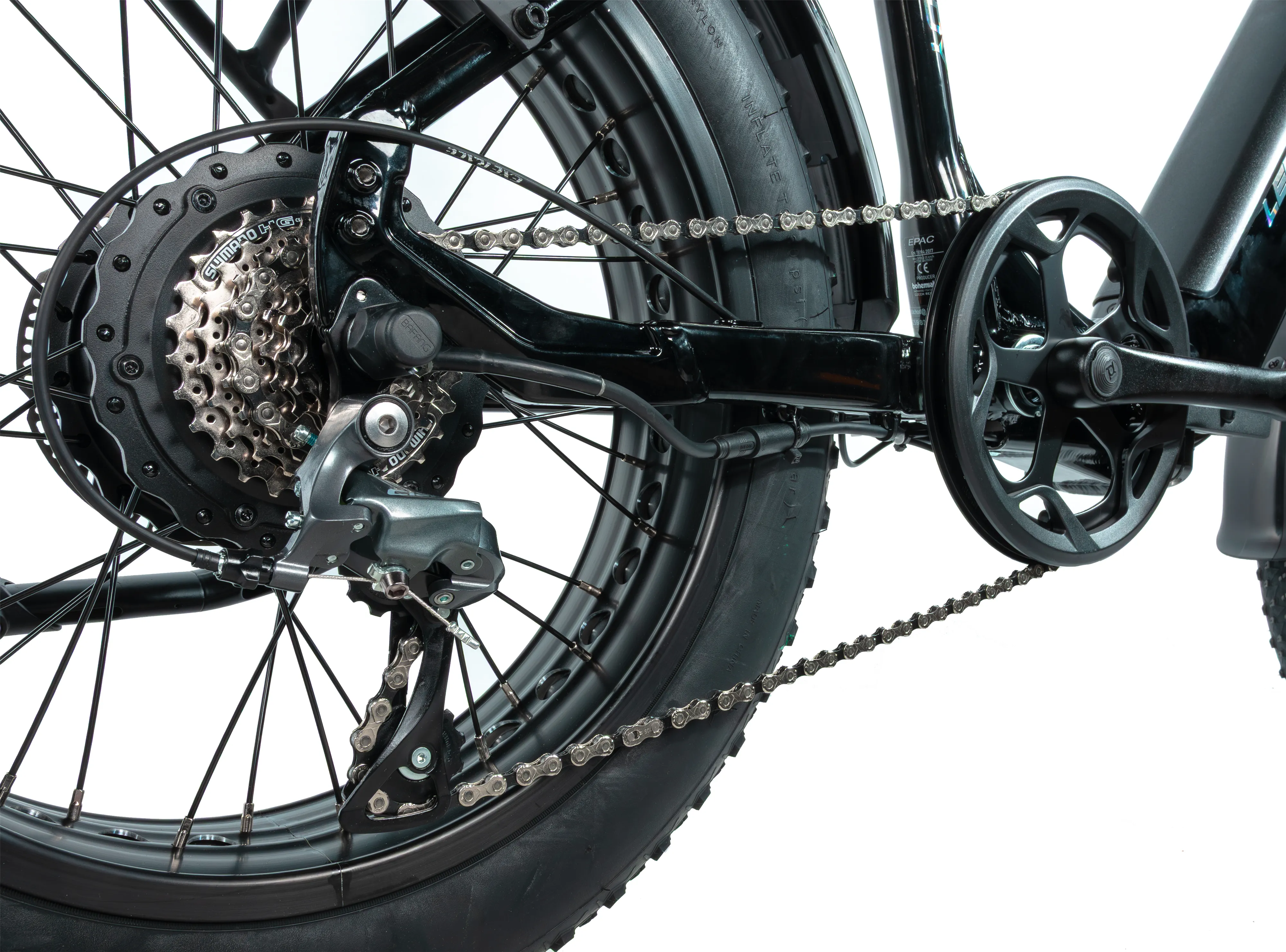 Electric FAT Bike Leader Fox CODY grips well on any surface thanks to wide tires on 20” wheels