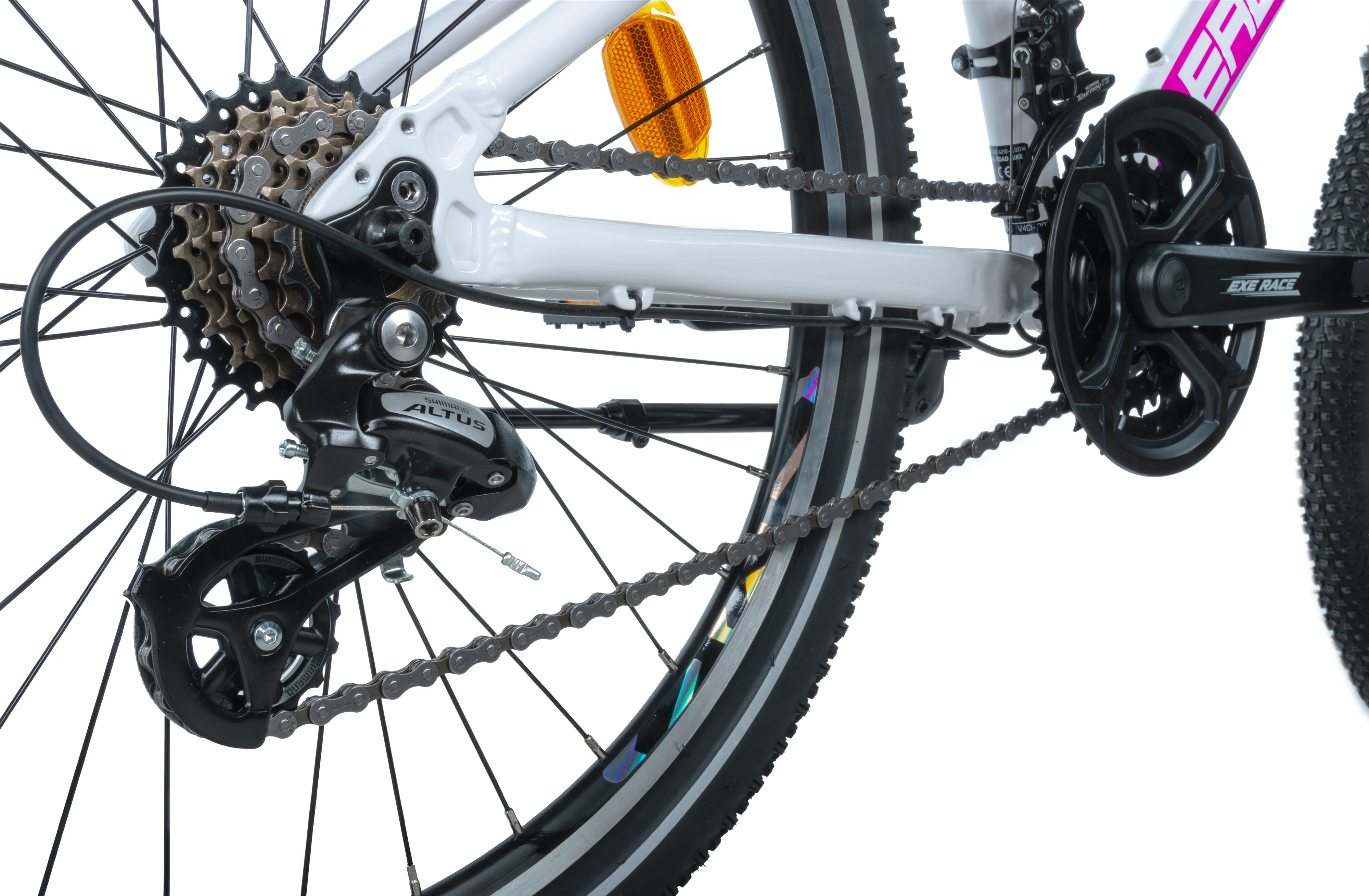CST 24x 2.10" tires ensure stability and grip on various types of surfaces. The bike is equipped with a simple and reliable 1×7-speed system from SHIMANO, which covers most off-road situations and allows the child to intuitively control it.